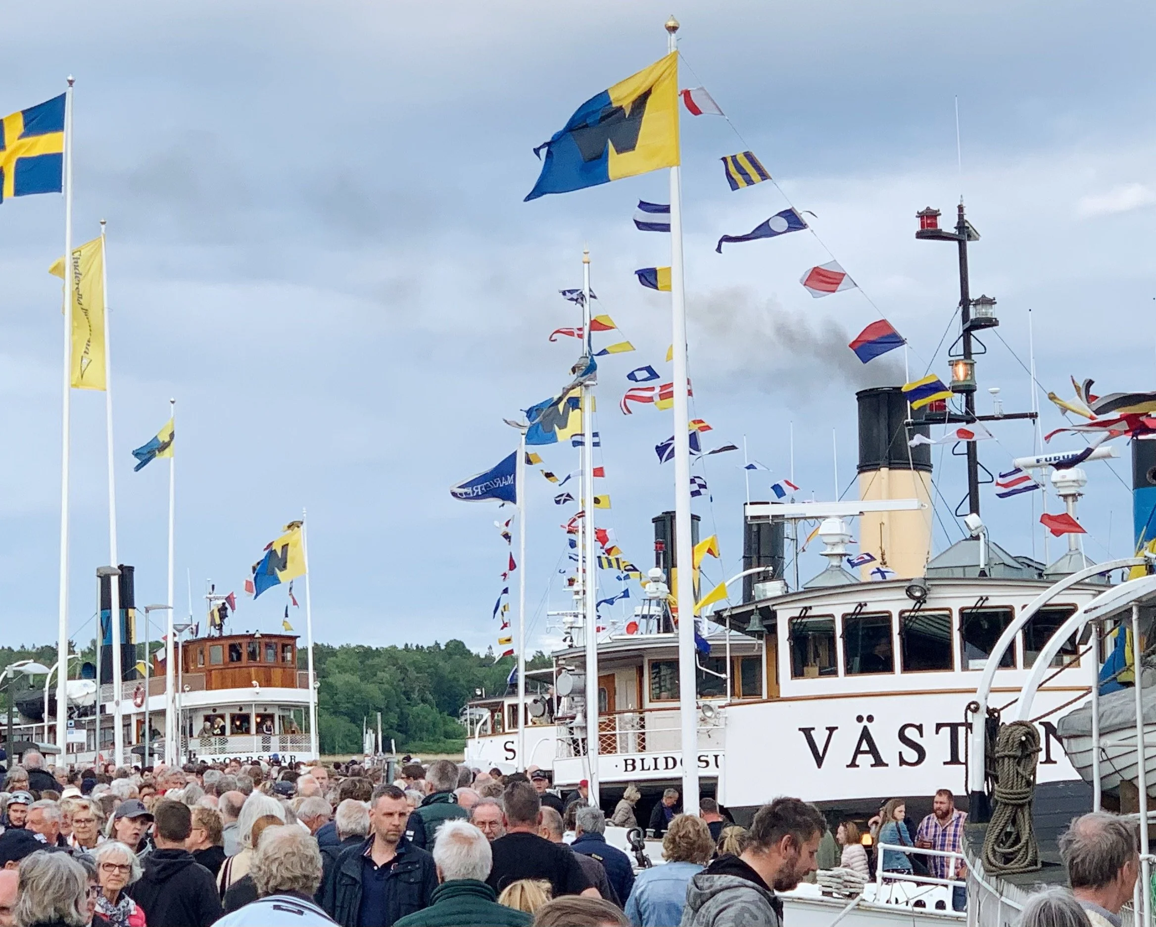 Fartygen blåser för avgång och lämnar kajen i kortege. Marknaden avslutas. Fartygen anlöper STRÖMKAJEN ca 22.30